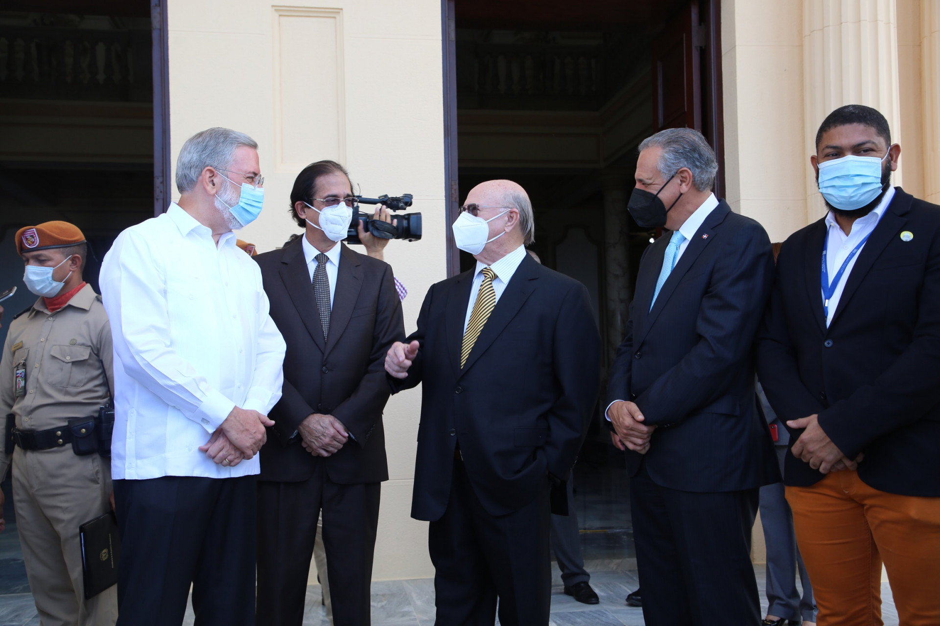 Los ministros de la Presidencia, Gustavo Montalvo; Administrativo de la Presidencia, José Ramón Peralta; y el director general de DICOM y portavoz del Gobierno, Roberto Rodríguez Marchena, mientras despiden al expresidente Hipólito Mejía, quien dijo tener una estrecha amistad con el Gobernante.