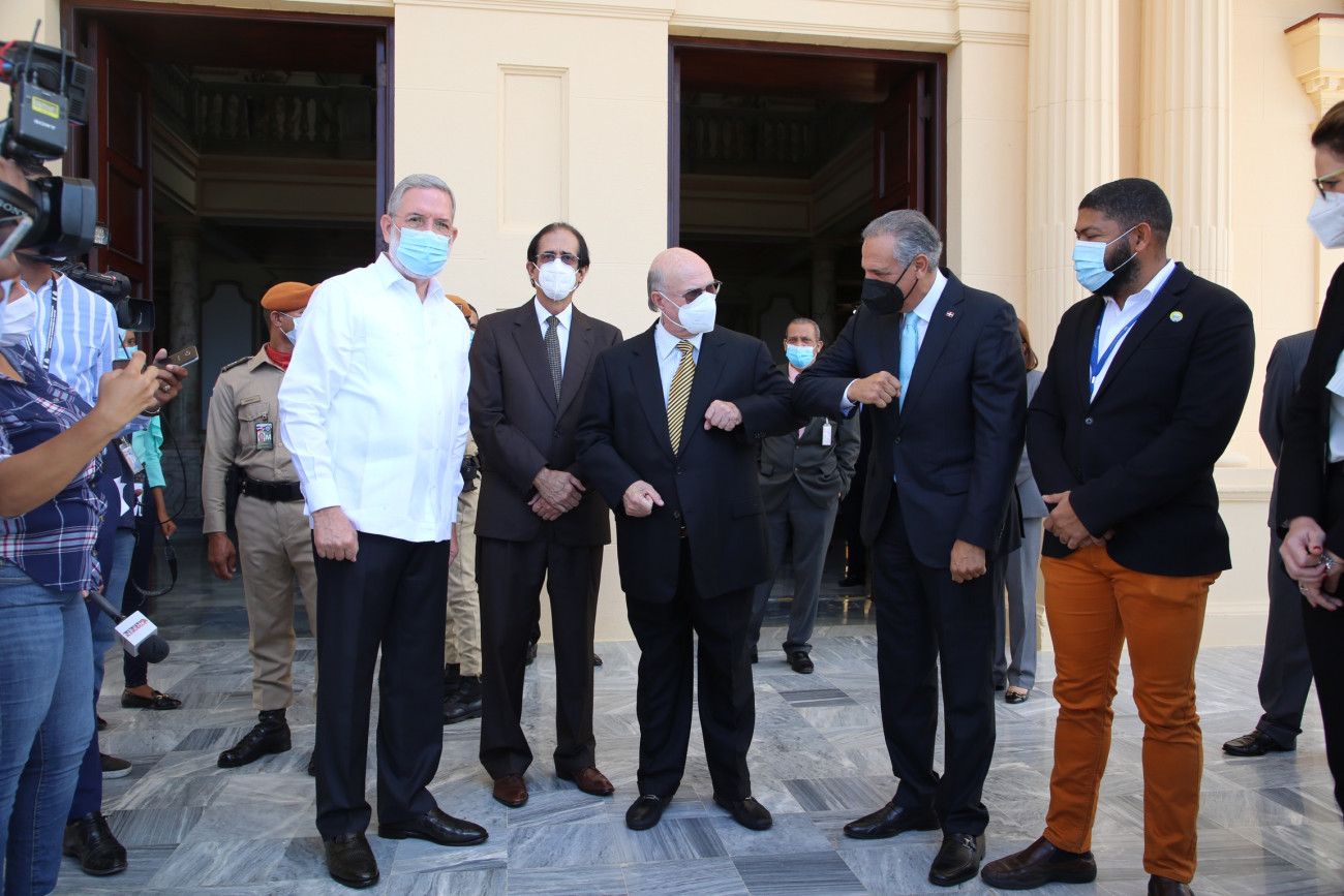 Los ministros de la Presidencia, Gustavo Montalvo; Administrativo de la Presidencia, José Ramón Peralta; y el director general de DICOM y portavoz del Gobierno, Roberto Rodríguez Marchena, mientras despiden al expresidente Hipólito Mejía, quien dijo tener una estrecha amistad con el Gobernante.