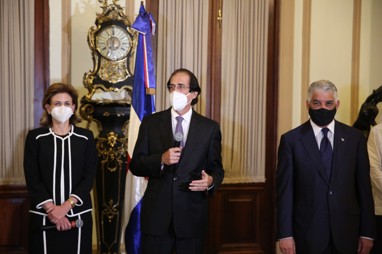 Vicepresidenta electa, Raquel Peña; ministro de la Presidencia, Gustavo Montalvo, y el ministro de Relaciones Exteriores, Miguel Vargas, en el Salón Verde del Palacio Nacional.