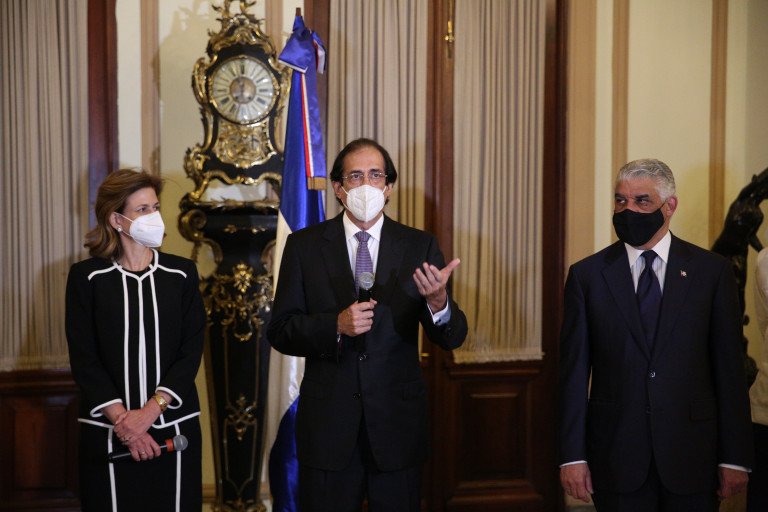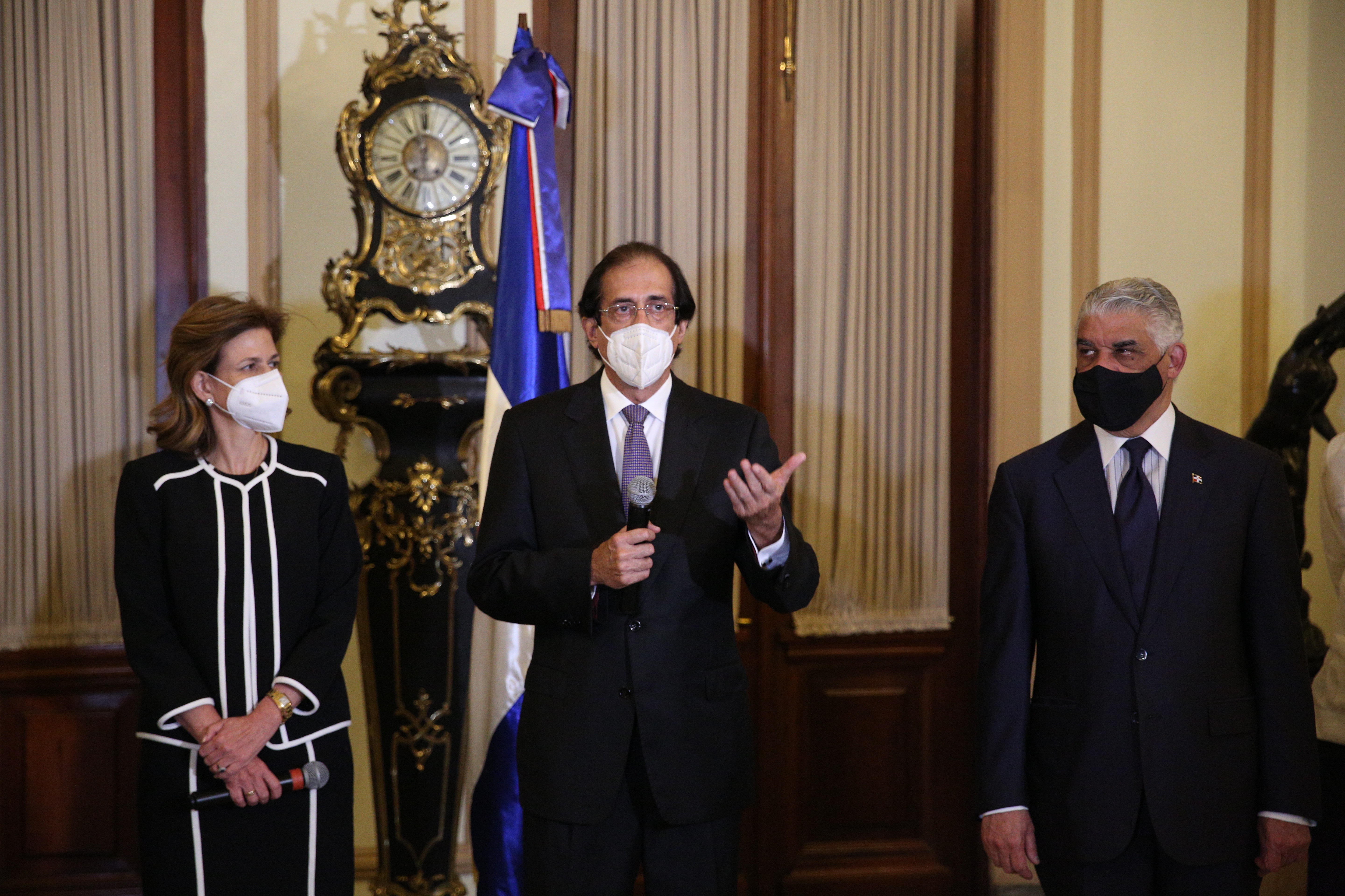 Ministro de la Presidencia, Gustavo Montalvo acompañado de la vicepresidenta electa y coordinadora del gabinete de salud por el presidente electo, Raquel Peña, y el ministro de Relaciones Exteriores, Miguel Vargas.