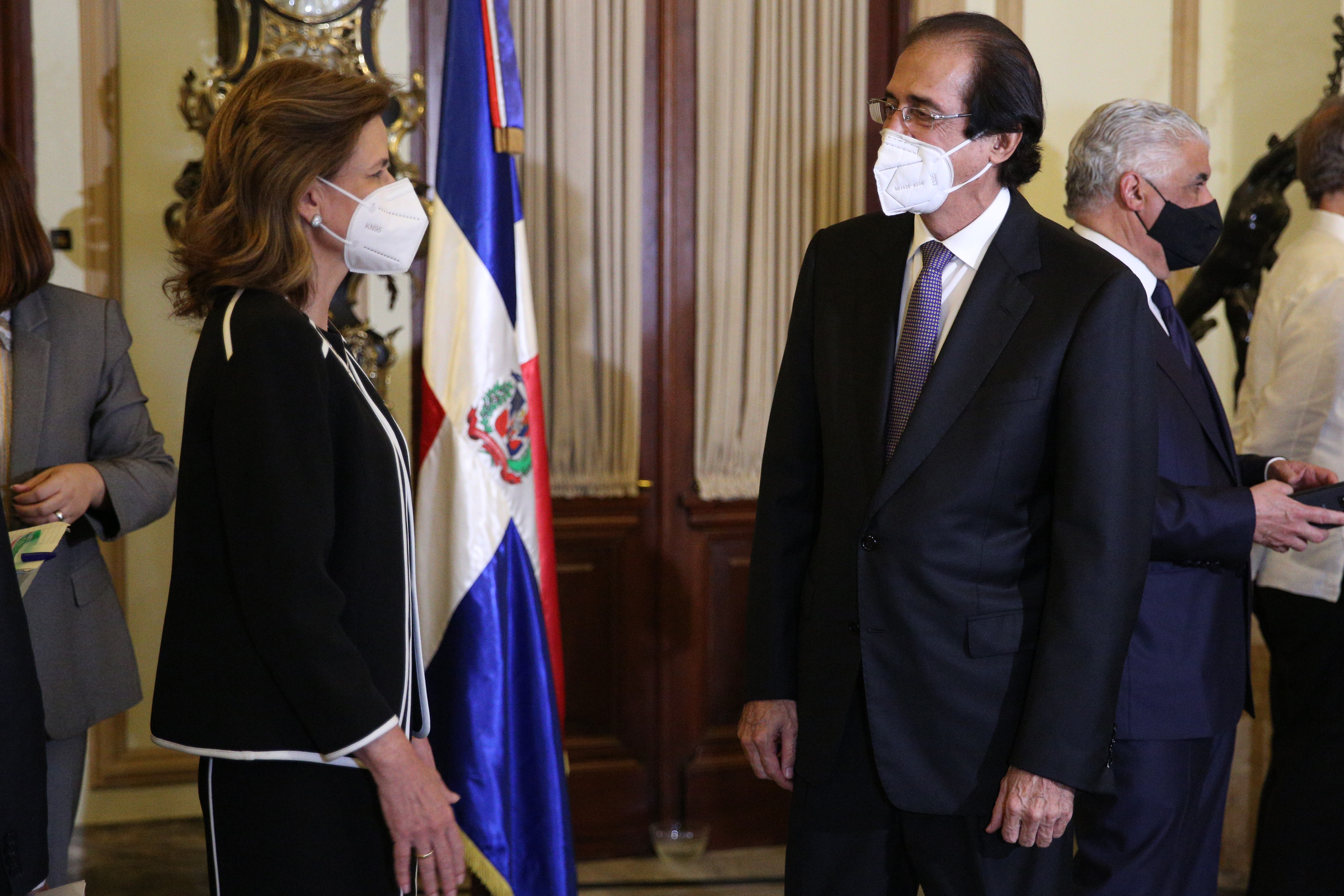 Ministro de la Presidencia, Gustavo Montalvo acompañado de la vicepresidenta electa y coordinadora del gabinete de salud por el presidente electo, Raquel Peña, durante reunión de trabajo, en el Palacio Nacional.