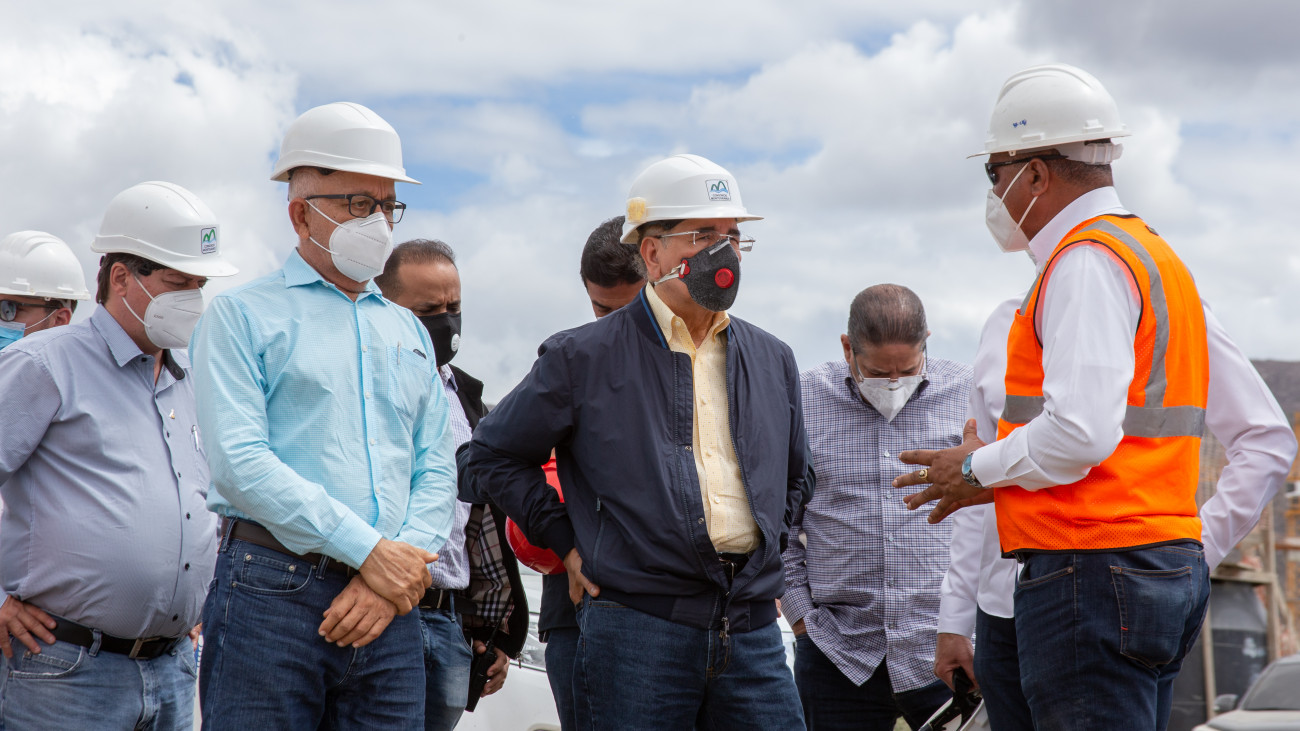 Presidente Danilo Medina acompañado del director ejecutivo del INDRHI, Olgo Fernández; el ministro de Hacienda, Donald Guerrero; el jefe del Cuerpo de Seguridad Presidencial, mayor general Adán Cáceres Silvestre; Carlos Pared Pérez, asistente personal del Presidente de la República, e ingenieros responsables de la construcción.