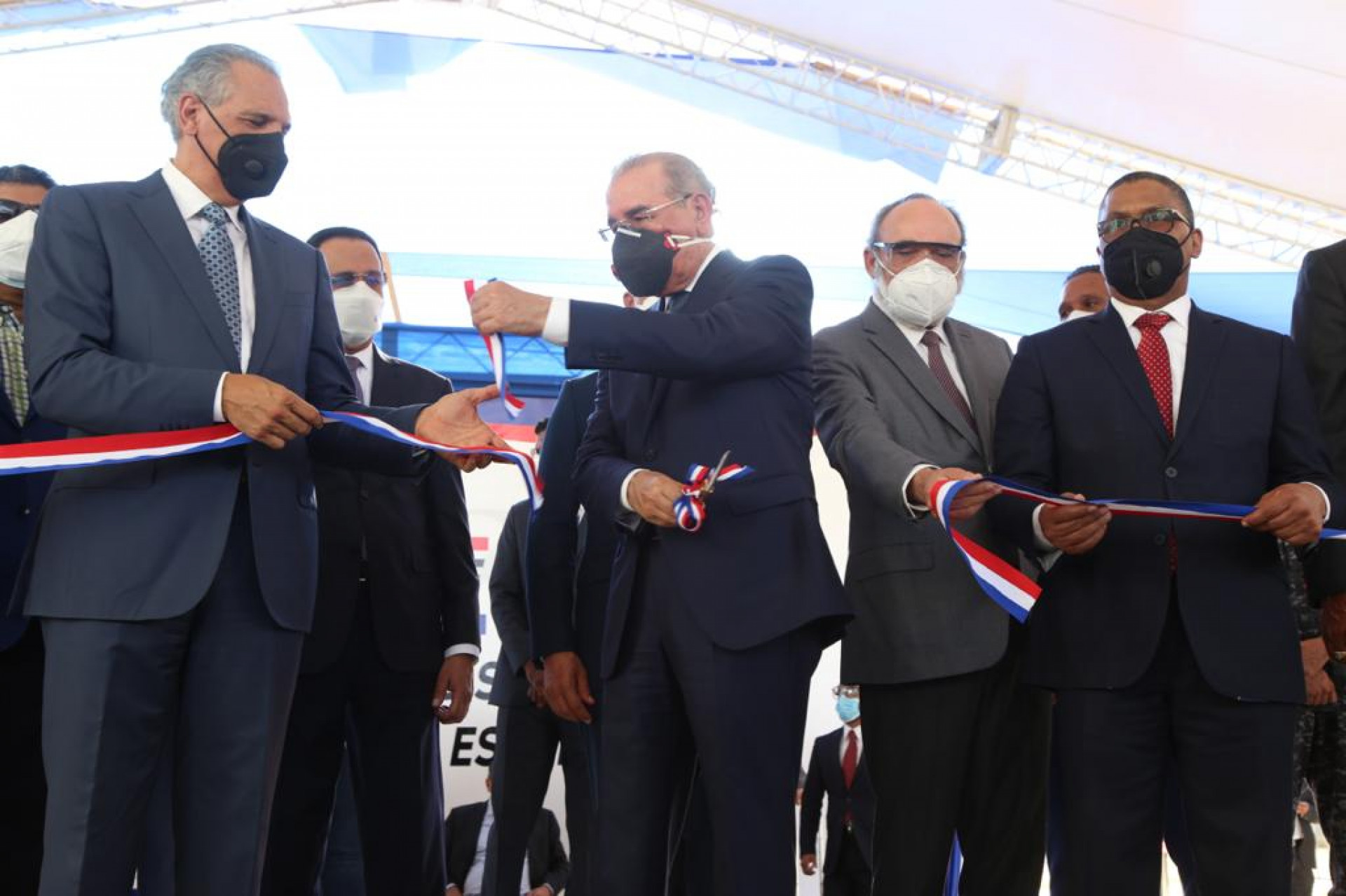 El presidente Danilo Medina corta la cinta en el acto inaugural por entrega del Proyecto de Transformación Urbana y Ambiental El Riito, en La Vega. Simultáneamente, también dejó inaugurado el Centro Educativo del Nivel Secundario Prof. Carmen Gil Tapia (Básica La Vega 6).