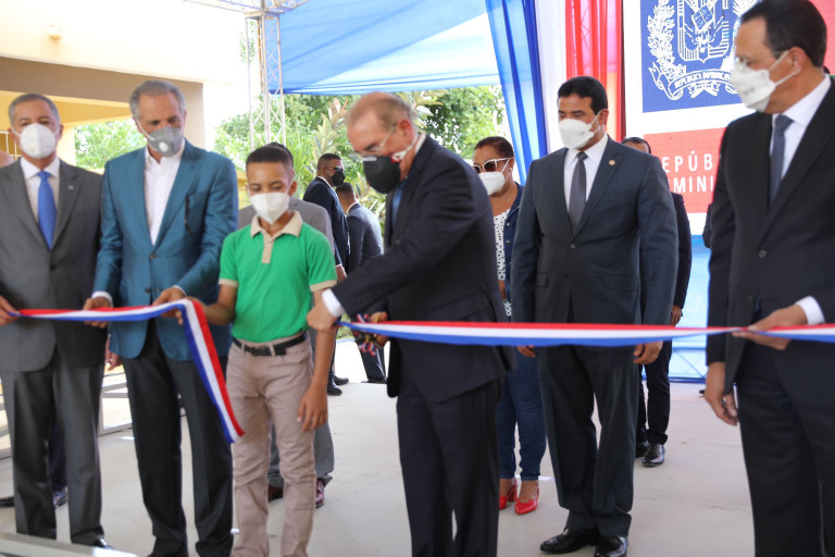 El presidente Danilo Medina corta la cinta inaugural por entrega de 19 escuelas y tres estancias infantiles, realizado hoy de forma conjunta desde el nuevo Centro Educativo del Nivel Secundario Ramón Matías Mella, en San Pedro de Macorís.
