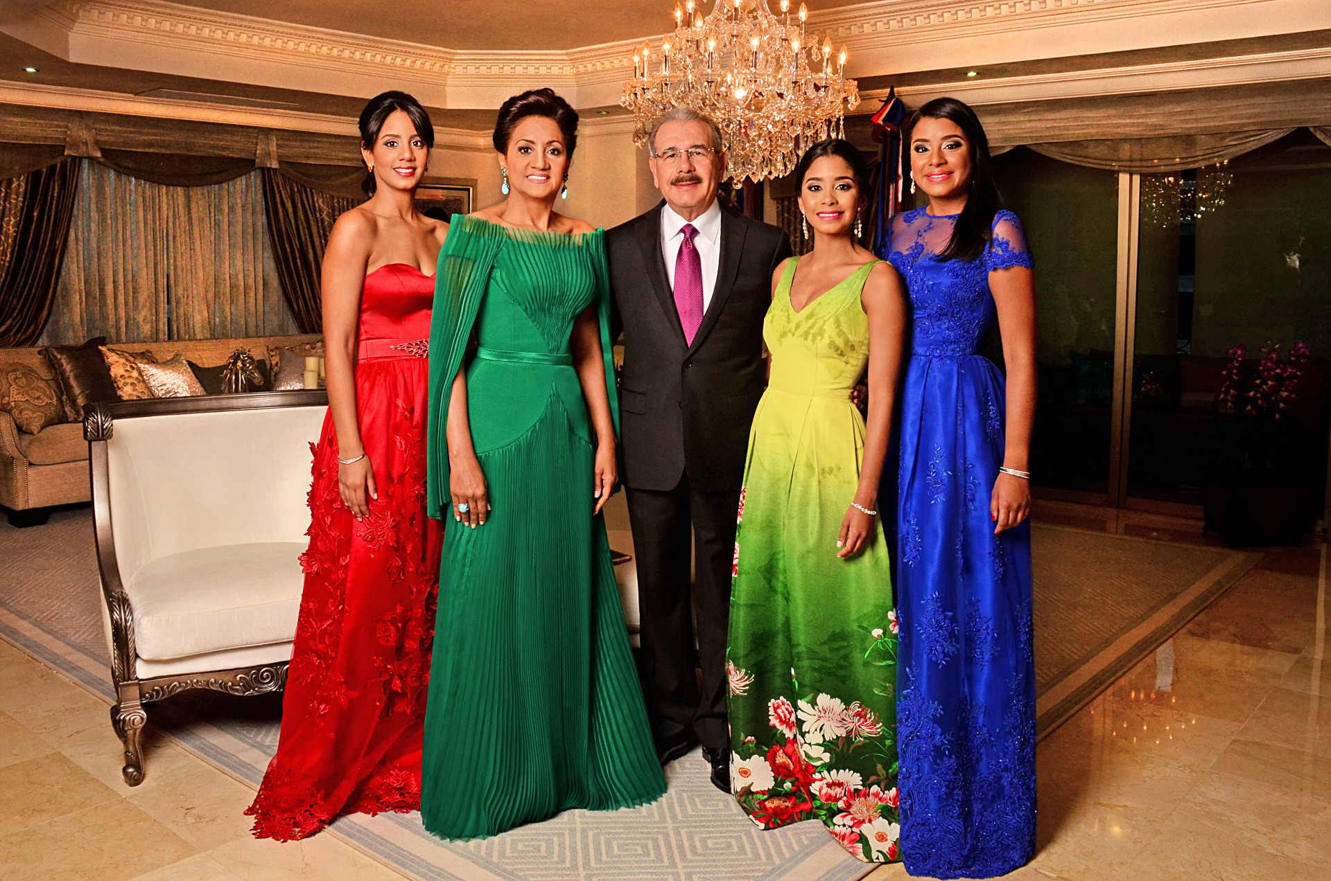 El presidente de la República, Danilo Medina, acompañado de su esposa la primera dama, Cándida Montilla de Medina, y sus hijas Candy Sibeli, Vanessa y Ana Paula.