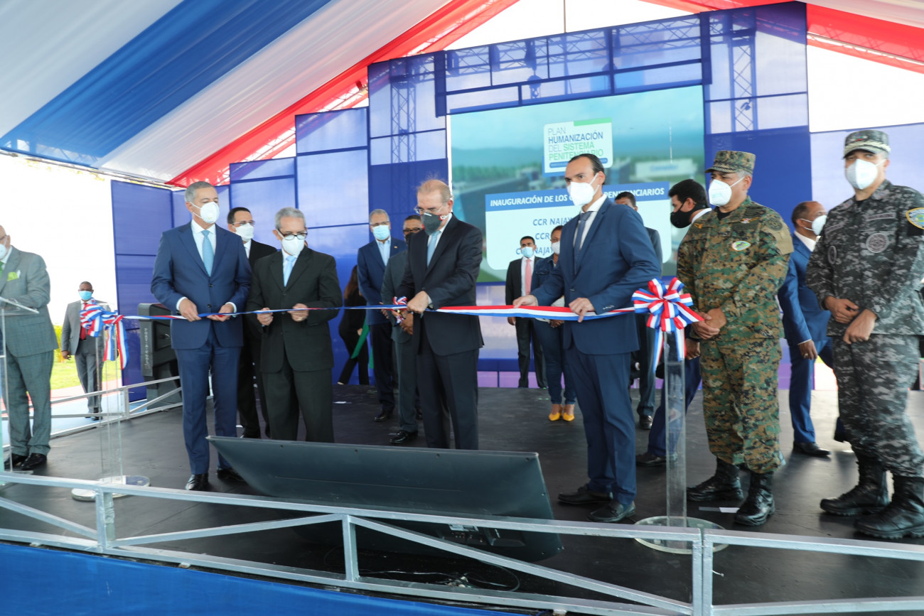 El presidente Danilo Medina corta la cinta inaugural para dejar en funcionamiento los Centros de Corrección y Rehabilitación (CCR) de Najayo Hombres, Najayo Mujeres y Najayo Sancristobalense.