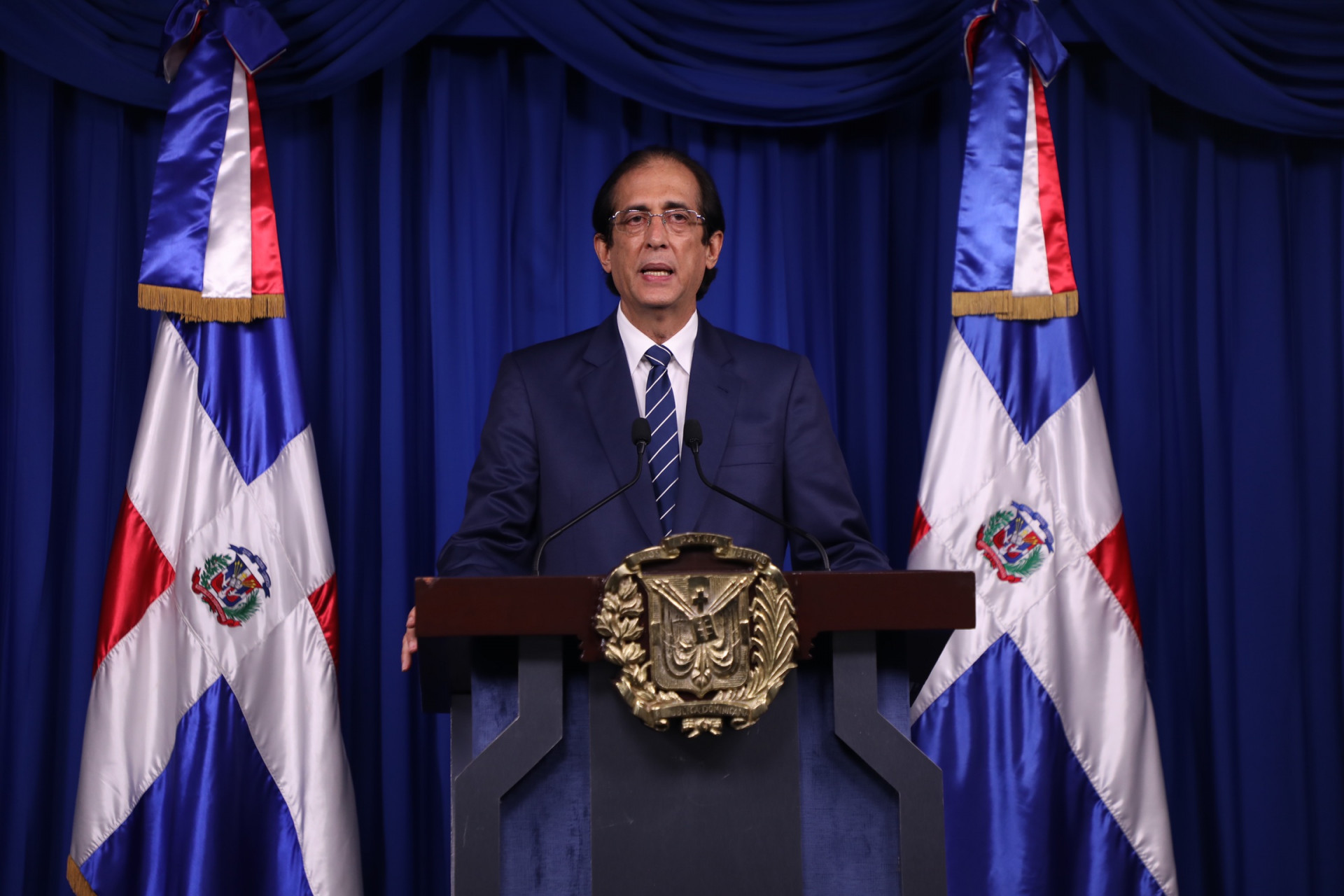 Ministro de la Presidencia, Gustavo Montalvo, en su calidad de coordinador de la Comisión de Alto Nivel para la Prevención y el Control del Coronavirus (COVID-19), al ofrecer el anuncio mediante webconferencia desde el Palacio Nacional.