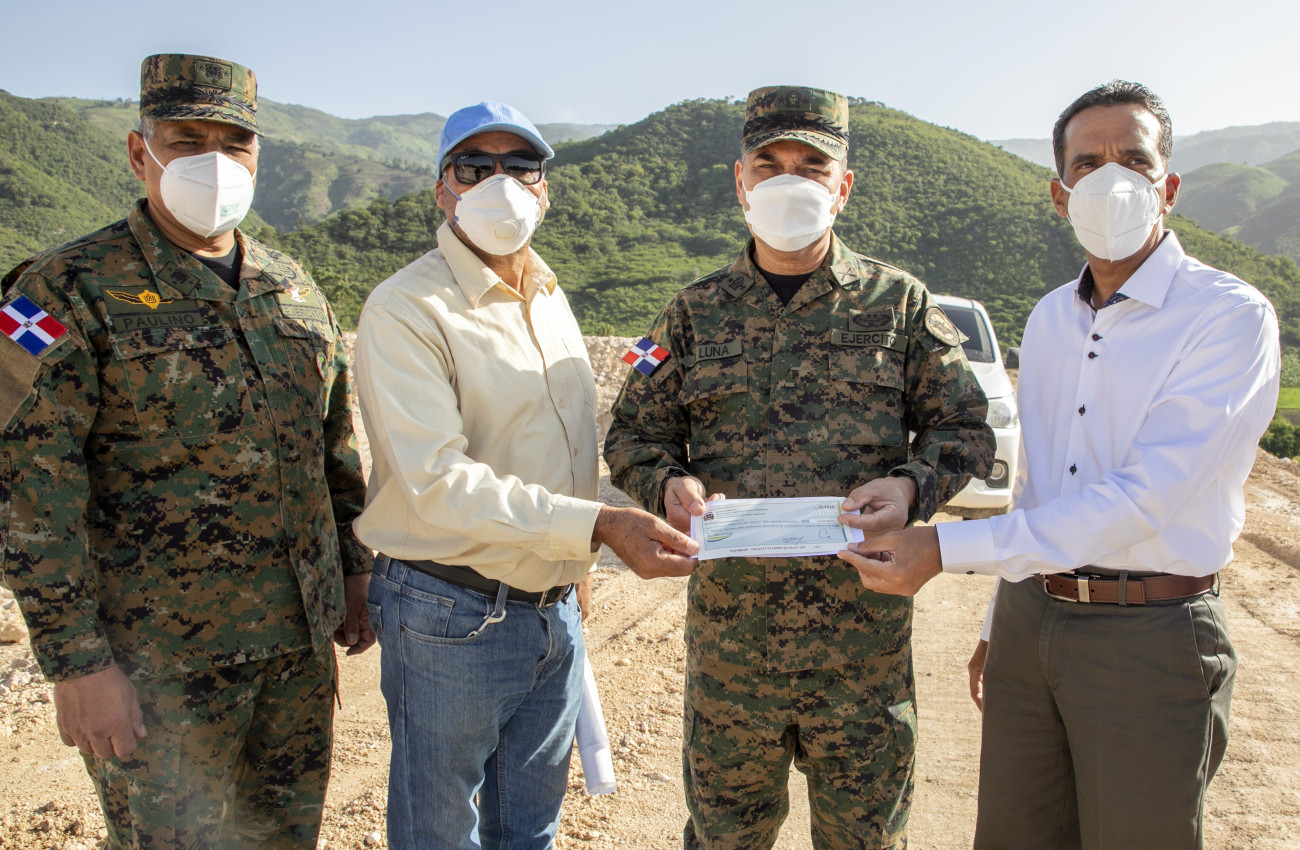 El viceministro de Producción y Desarrollo Comunitario del Ministerio Administrativo de la Presidencia, Juan Pumarol, en compañía del ministro de Defensa, teniente general Rubén Darío Paulino Sem, y el director ejecutivo de la Unidad Técnica Ejecutora de los Proyectos de Desarrollo Agroforestal, mayor general Rafael Emilio de Luna Pichirilo, durante la entrega del cheque.