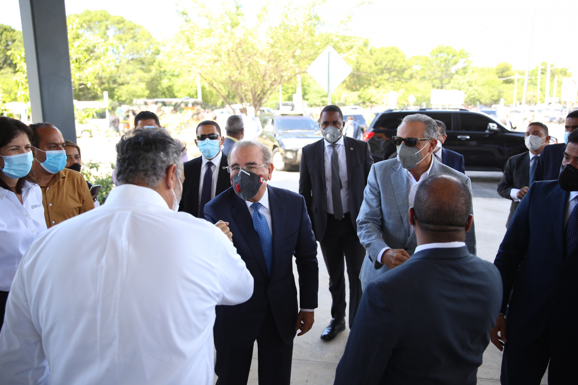 El presidente Danilo Medina saluda a Manuel Genao, presidente ejecutivo de la División Proyectos del Grupo Estrella, a su llegada a la Terminal Interregional de Autobuses Santo Domingo Este. Figura junto a ellos, José Ramón Peralta, ministro Administrativo de la Presidencia, entre otros.