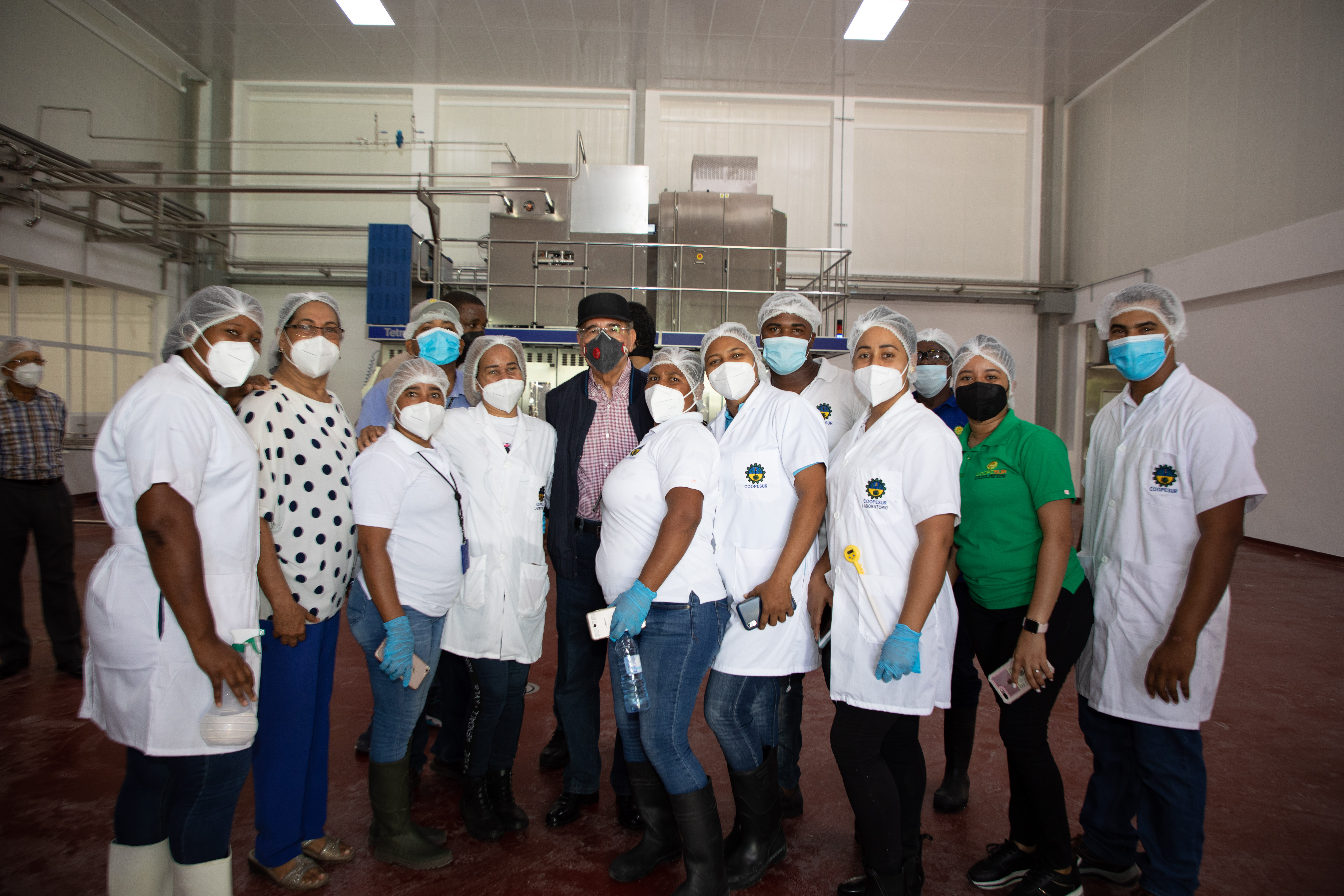 El presidente Danilo Medina junto a personal de planta de la Pasteurizadora Ysura, durante su recorrido por las instalaciones de la empresa.
