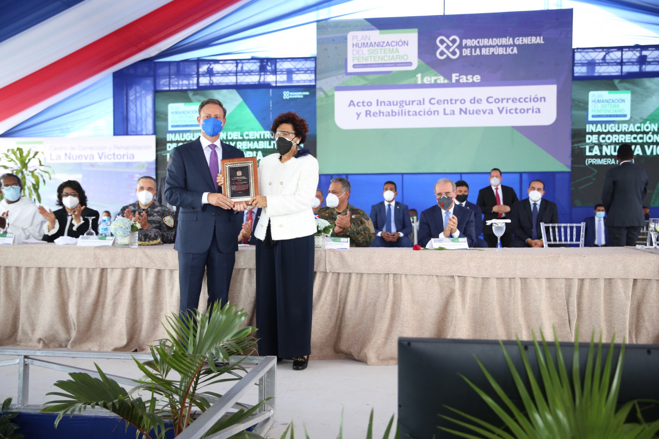 La defensora del Pueblo, Dra. Zoila Martínez Guante al momento de recibir un reconocimiento de manos del procurador general de la República, Jean Alain Rodríguez, quien reconoció el empeño de la Defensora del Pueblo, que por décadas venía demandando la sustitución del viejo penal de La Victoria.
