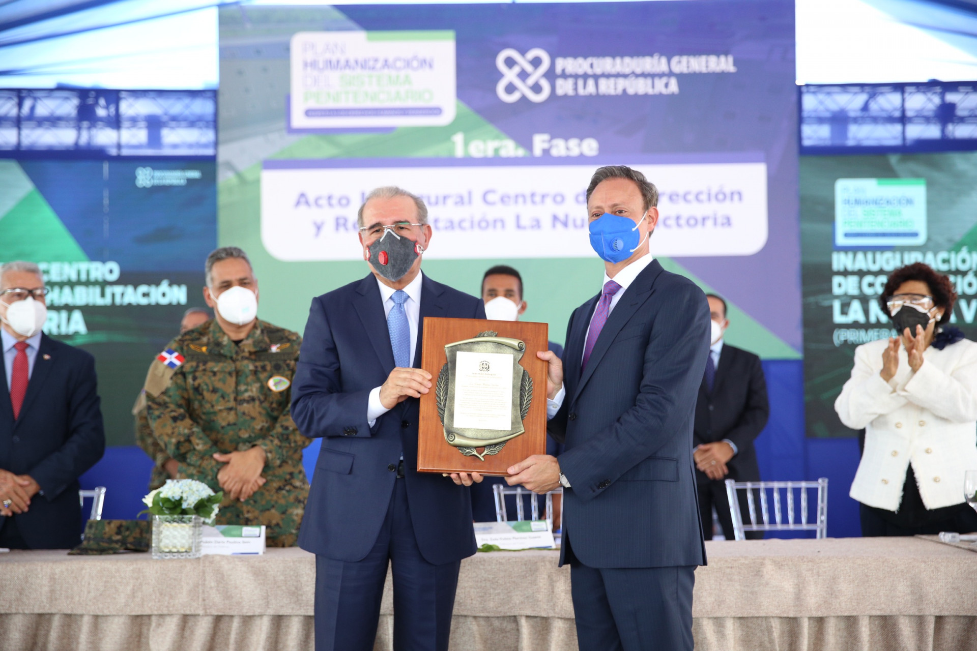 El presidente Danilo Medina recibió el reconocimiento de manos del procurador general de la República, Jean Alain Rodríguez, durante la entrega de la primera fase del Centro de Corrección y Rehabilitación La Nueva Victoria.
