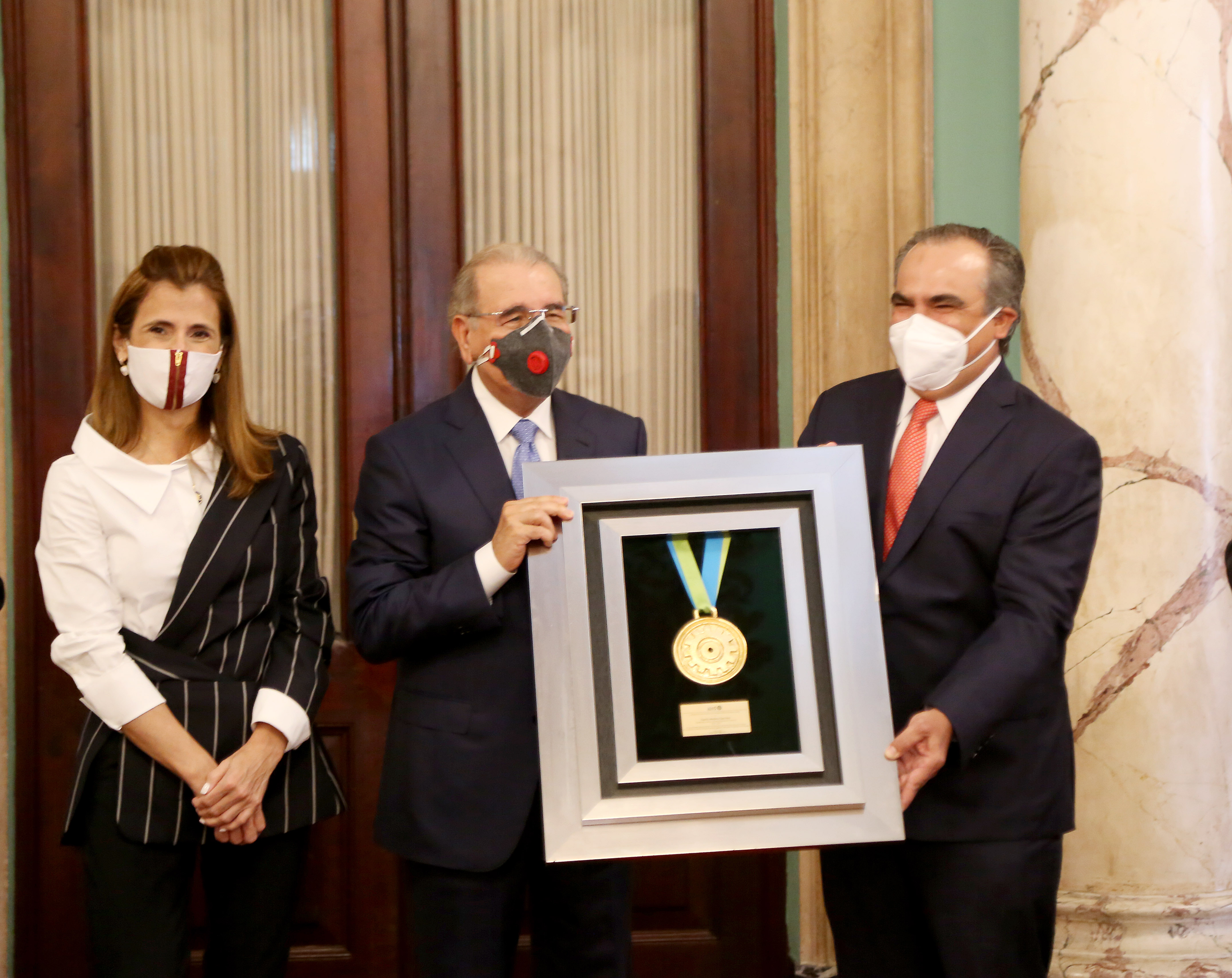 Ligia Bonetti. pasada presidenta de AIRD, presidente de la República Danilo Medina, y Celso Juan Marranzini, presidente de la AIRD, durante entrega del reconocimiento, realizada hoy en el Palacio Nacional.