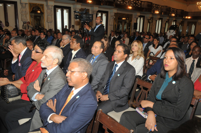 Comunicadores de todo el país presentes durante acto de primeros simulacros del Sistema de Emergencias 9-1-1, convocados por el ministro de la Presidencia, Gustavo Montalvo, en el Salón Las Cariátides del Palacio Nacional.