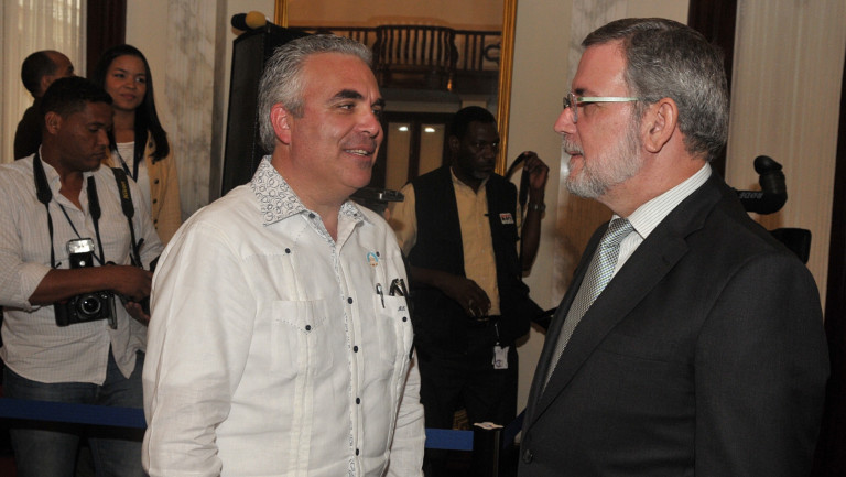 El portavoz del Gobierno y director de DICOM, Roberto Rodríguez Marchena, comparte junto al comunicador, Roberto Cavada, presente durante el encuentro.