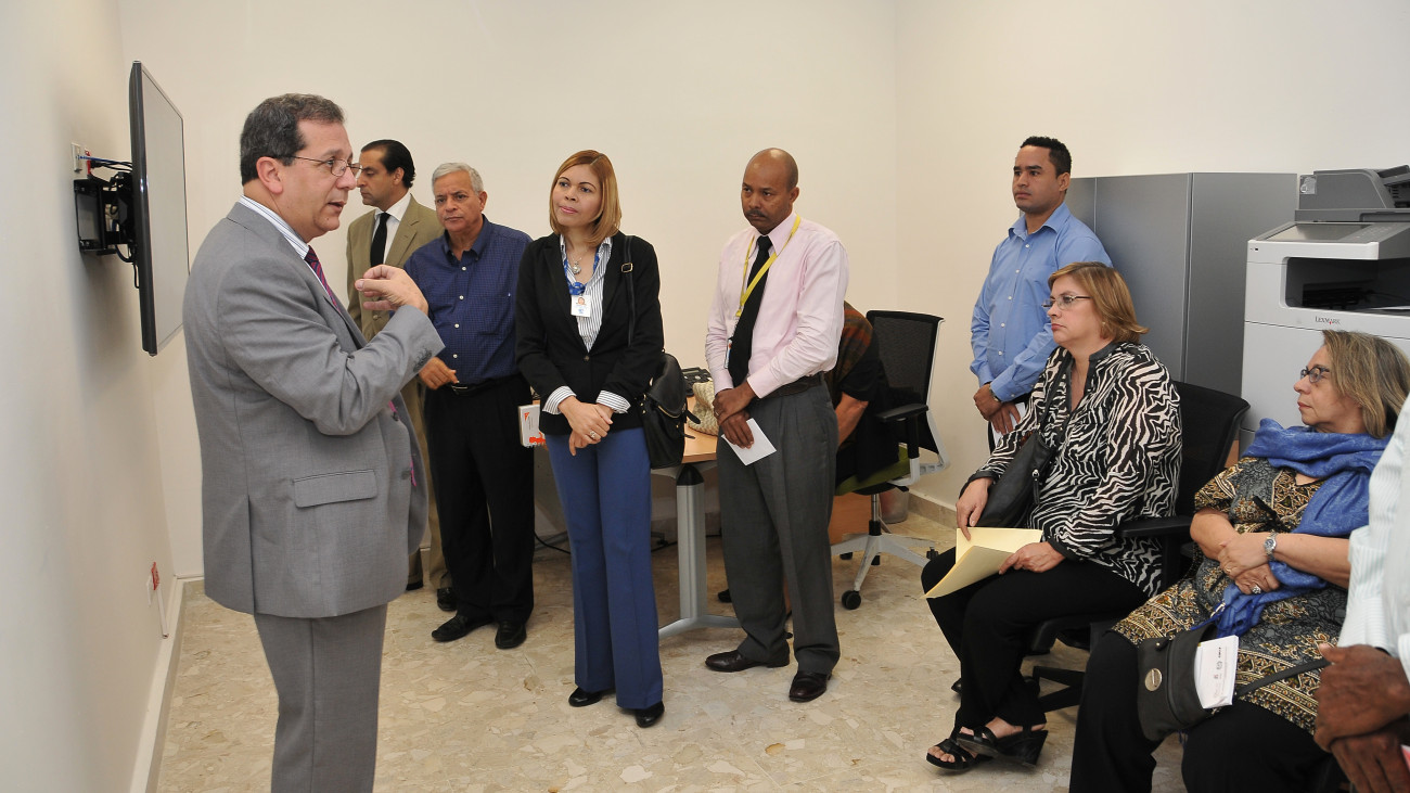 Dalvert Polanco, director ejecutivo del Sistema 9-1-1, mientras ofrece explicaciones a representantes del Instituto Nacional de la Salud, Gisele Scanlon y de Alianza ONG, Rosanna Morillo y personalidades presentes, durante recorrido por la sede del nuevo sistema de seguridad ciudadana, atendiendo invitación del Gobierno.