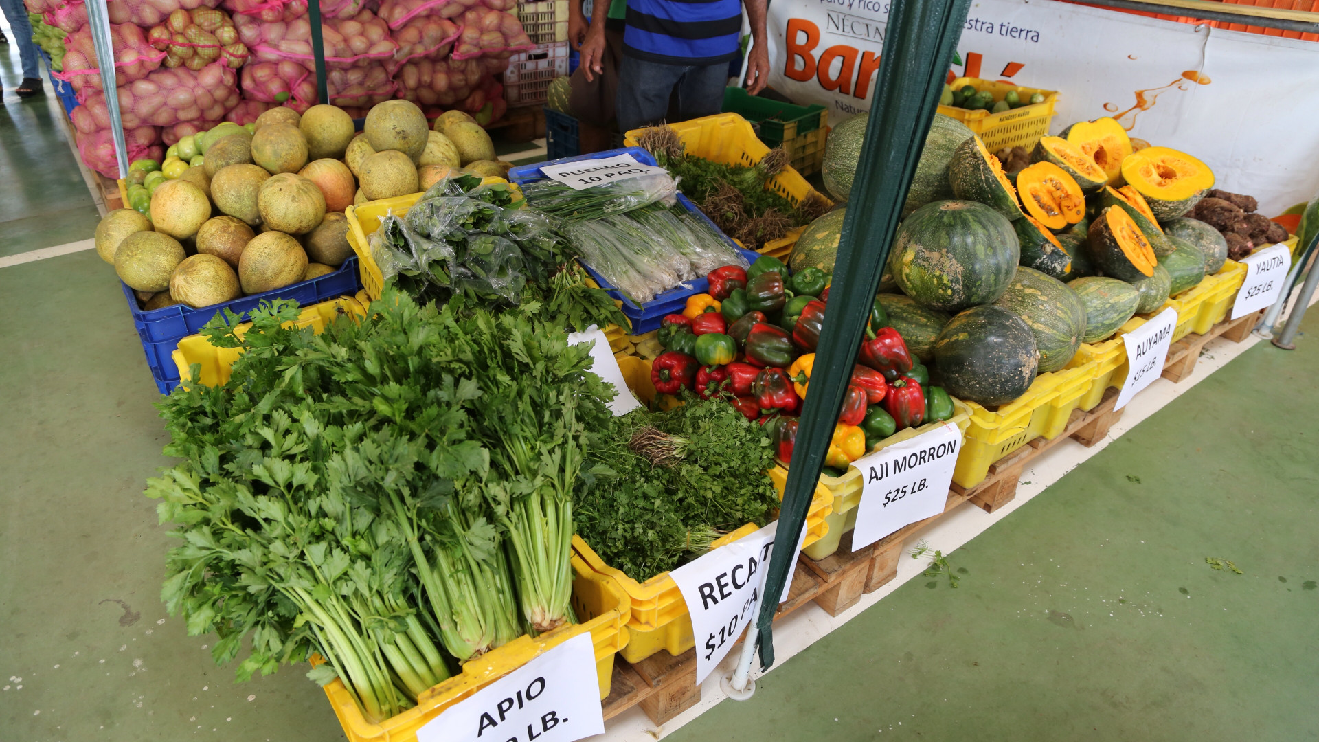 Productos agrícolas disponibles para la venta durante acto de apertura del Merca Santo Domingo, ubicado en la comunidad de Pedro Brand, el cual cuenta con 6 grandes naves de 7,200 metros cuadrados cada una, y un gran almacén frigorífico con 14 cámaras de enfriamiento y un amplio parqueo para 1,650 vehículos.