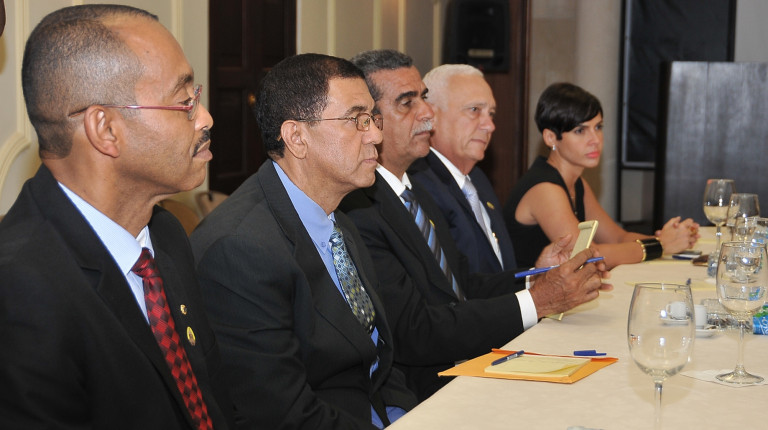 Integrantes de la Comisión de Veeduría del Ministerio de Hacienda, presentes durante el encuentro efectuado hoy con el ministro de la Presidencia Gustavo Montalvo, en el Salón Hermanas Mirabal del Palacio Nacional.