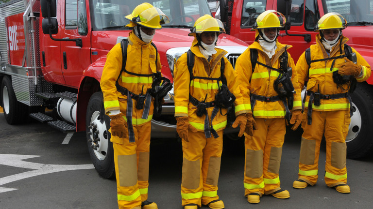 Personal del Cuerpo de Bomberos del Gran Santo Domingo al servicio del Sistema de Emergencias 9-1-1. Los trajes de combate de incendios han sido diseñados para satisfacer las exigentes condiciones que los bomberos se enfrentan cada día.