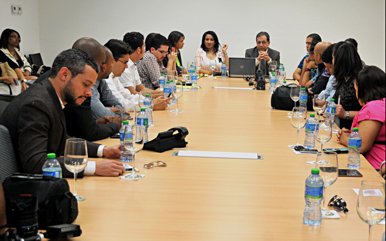 El director ejecutivo del Sistema de Emergencias 9-1-1, Dalvert Polanco y la viceministra de la Presidencia, Zoraima Cuello, durante encuentro con líderes en medios sociales e Internet, invitados a conocer el funcionamiento del nuevo sistema de seguridad, en la sede de la institución.