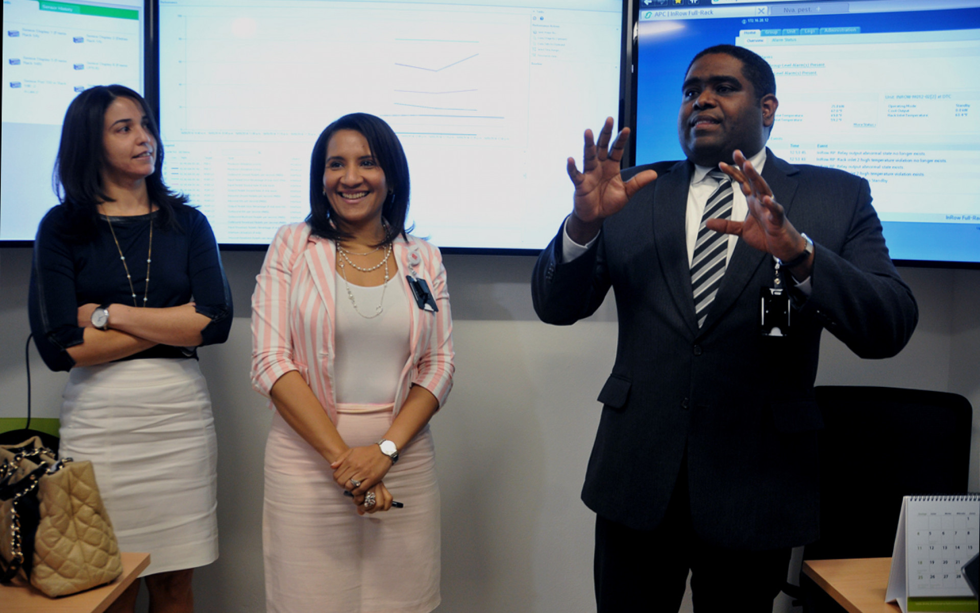 Zoraima Cuello, viceministra de la Presidencia y personal de la institución, mientras ofrecen explicaciones sobre el funcionamiento del Sistema de Emergencias 9-1-1, a los visitantes.