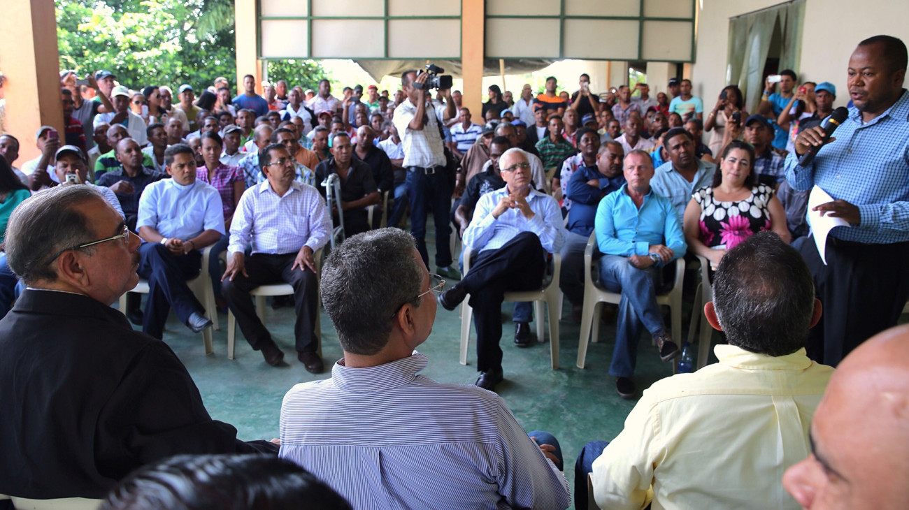 El presidente Medina durante su visita por la comunidad de Las Cabuyas, en La Vega, donde se reunió con productores agrícolas agrupados en Asociación de Productores de Vegetales Orientales, quienes solicitaron ayuda para construir una planta empacadora, mejorar sus plantaciones y duplicar su productividad.