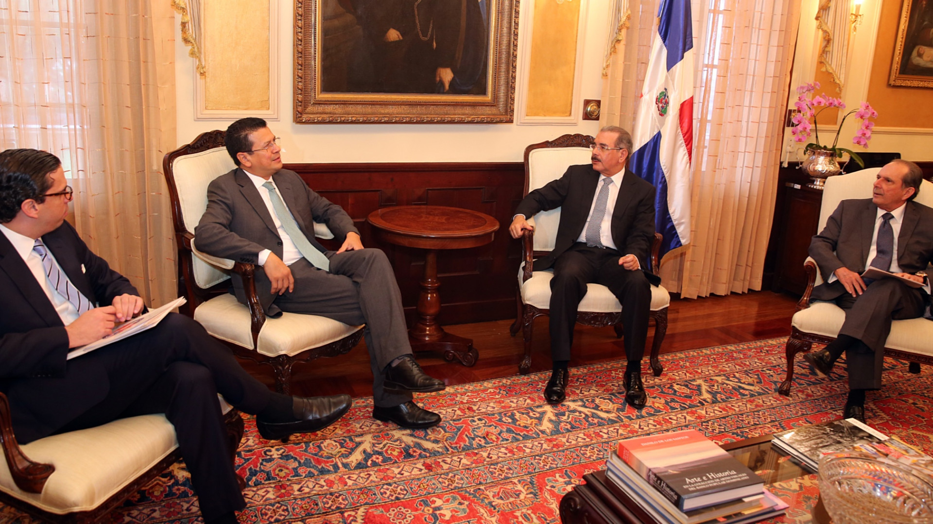 Presidente Danilo Medina junto al secretario general del Sistema de la Integración Centroamericana (SICA), Hugo Róger Martínez y los viceministros de Relaciones Exteriores, José M. Trullols; y César R. Dargam Espaillat, durante encuentro efectuado en su despacho del Palacio Nacional.