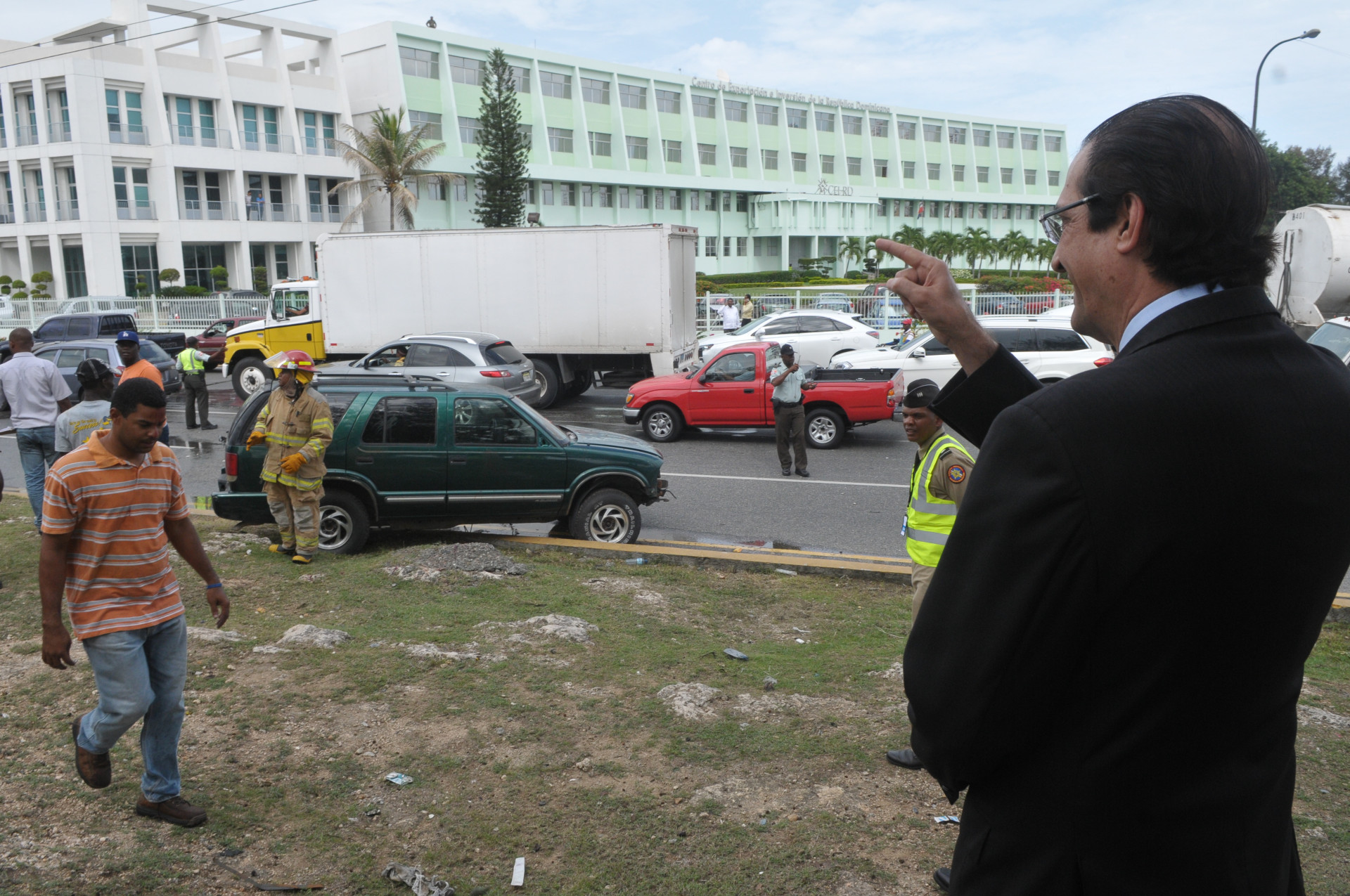 El ministro de la Presidencia, Gustavo Montalvo, supervisa un simulacro de un triple accidente, en el que intervinieron dos vehículos y una motocicleta, y uno de ellos se incendió, lo que creó una situación de rescate de los pasajeros, en la Plaza de la Bandera.