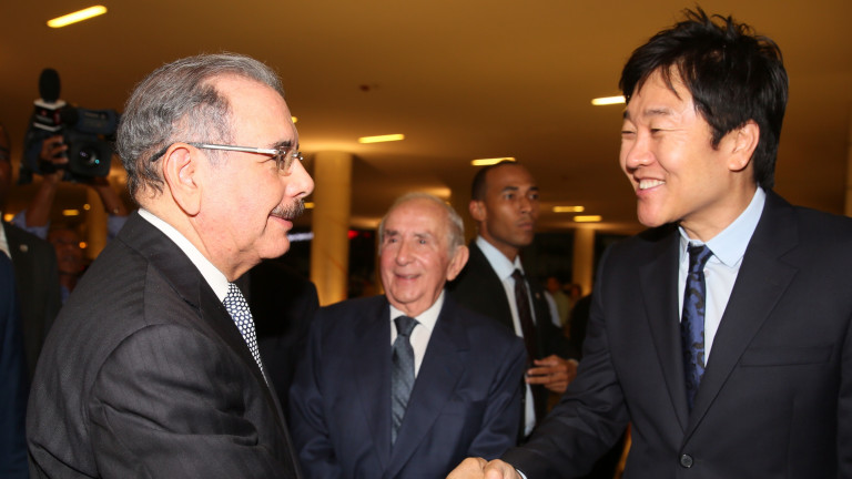 El presidente Medina es recibido por el señor Do Won Chan, fundador y presidente de la tienda FOREVER 21 y otros anfitriones del evento.