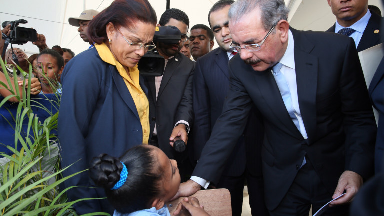 Presidente Danilo Medina escucha a Hilvania Duarte del sexto grado de la Escuela Juan Bautista de la Cruz. El presidente de la República prometió a la niña que personalmente estudiará su solicitud y de inmediato dispuso que se le entregara una moderna laptop. La estudiante dijo sentirse satisfecha por la respuesta inmediata del gobernante y agradeció la atención que le dispensara, antes de cortar la cinta para inaugurar en Conuco la escuela María Dolores Zeno.