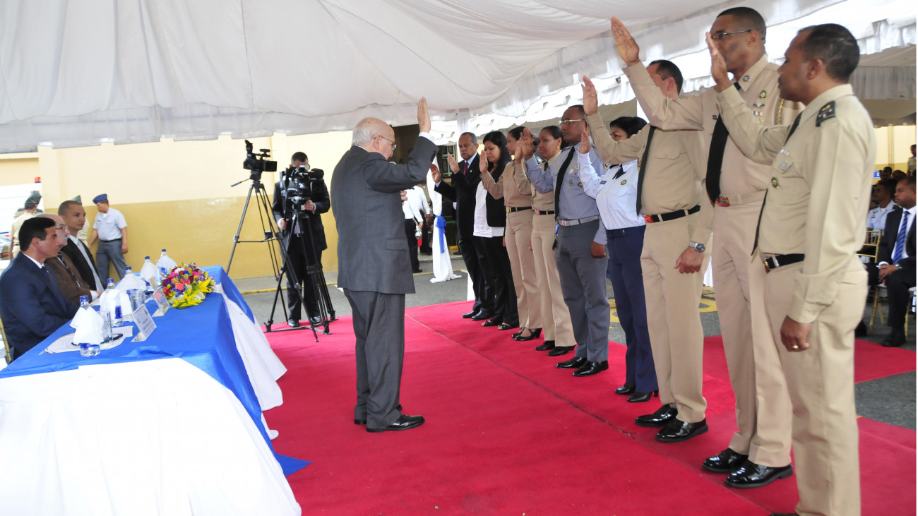 El Dr. Mario Viicio Castillo mientras procede a juramentar los Integrantes de la Comisión de Ética del Cuerpo de Seguridad Presidencial, conformada por el coronel Epifanio Peña Lebrón; capitana Elena Cabrera Martínez; coronela Cristina Altagracia Rodríguez y el teniente coronel Manuel Silverio Santana. Además, el mayor Rafael Núñez de Aza; la mayor María Altagracia Valenzuela, cabo Yulisa Joaquín Abreu y el periodista Julio Valdéz, relacionista público de la entidad.