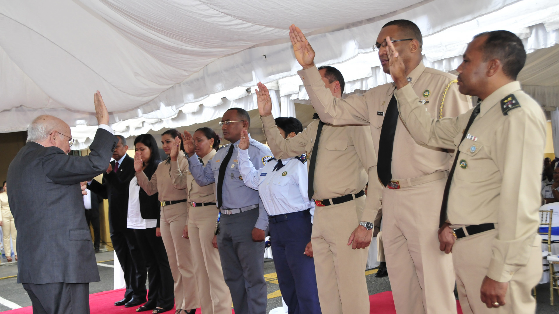 El Dr. Mario Viicio Castillo mientras procede a juramentar los Integrantes de la Comisión de Ética del Cuerpo de Seguridad Presidencial, conformada por el coronel Epifanio Peña Lebrón; capitana Elena Cabrera Martínez; coronela Cristina Altagracia Rodríguez y el teniente coronel Manuel Silverio Santana. Además, el mayor Rafael Núñez de Aza; la mayor María Altagracia Valenzuela, cabo Yulisa Joaquín Abreu y el periodista Julio Valdéz, relacionista público de la entidad.